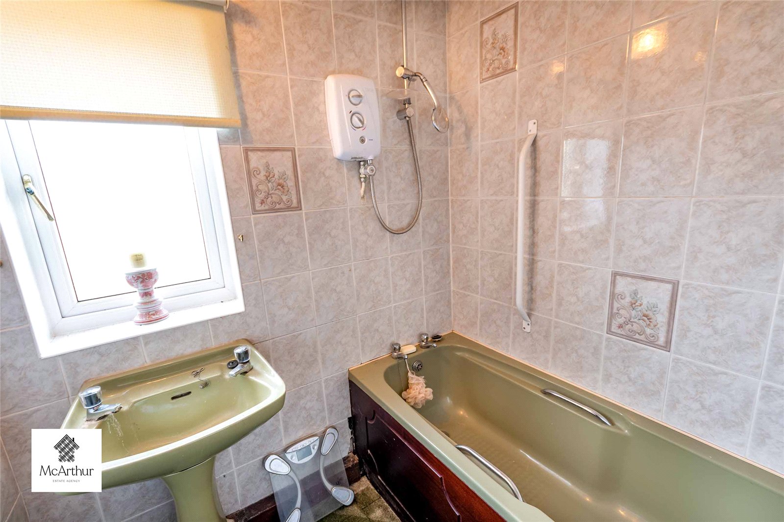 Going up the stairs there are two double bedrooms. In the master bedroom there are large windows and plentiful cupboard space. Both bedrooms are neutrally decorated. In the main bathroom there is an overhead shower with a bath and floor to ceiling tiles and features a sage green bathtub and sink.