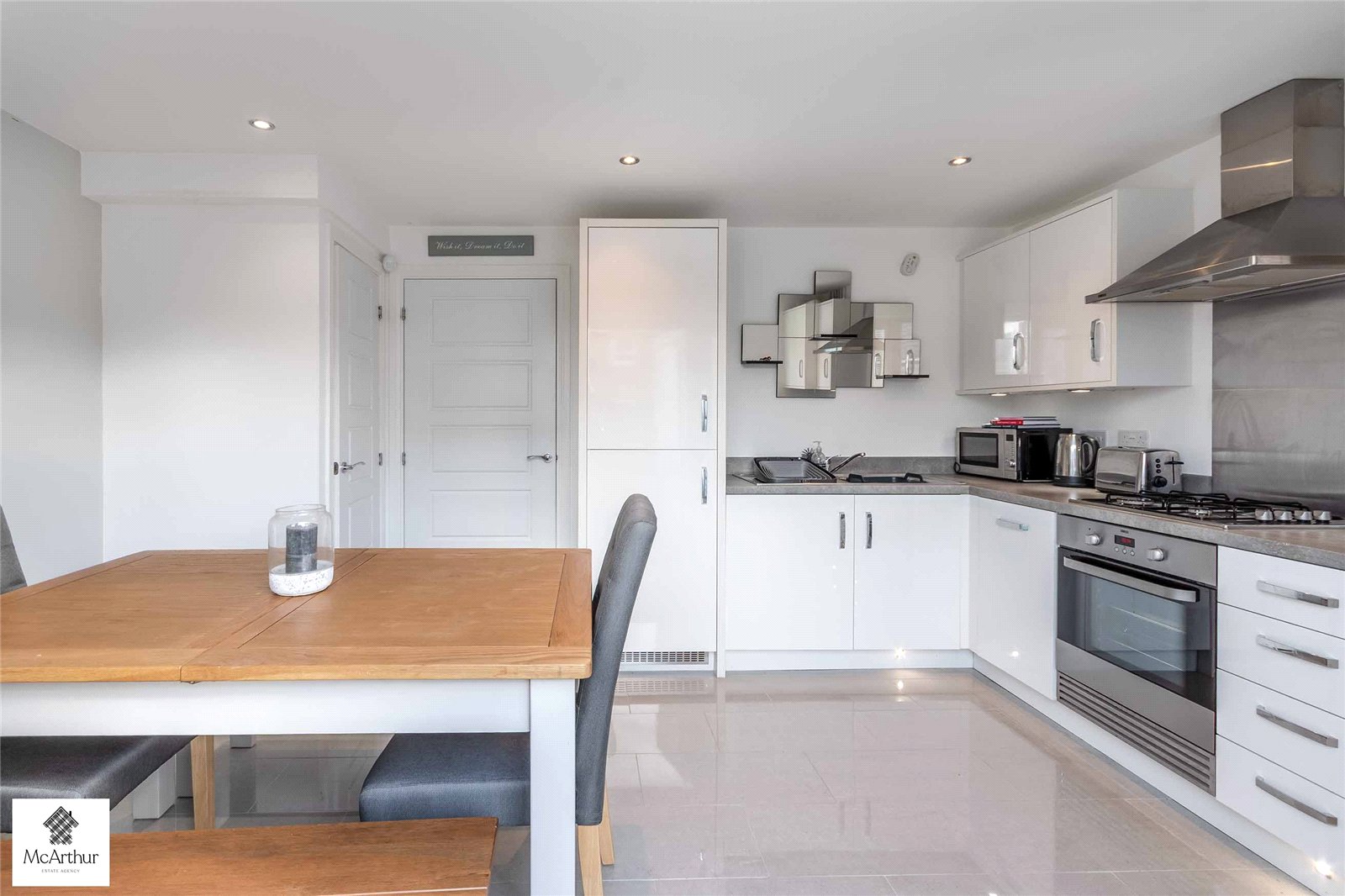 Walking into this property you are welcomed into a bright lounge, thoughtfully decorated in neutral shades to create a calm living space. A large front-facing window allows an abundance of natural light to flood the room, enhancing the sense of openness and creating an inviting area for both relaxing and entertaining. Through the lounge you access the modern kitchen which is both functional and stylish, featuring sleek high-gloss floor tiles that add a contemporary touch. Beneath the kitchen tiles, this property benefits from underfloor heating. The kitchen is fitted with integrated appliances such as, oven and fridge freezer, offering convenience and a streamless finish. There is ample workspace and storage including a cupboard area, making it ideal for everyday living.