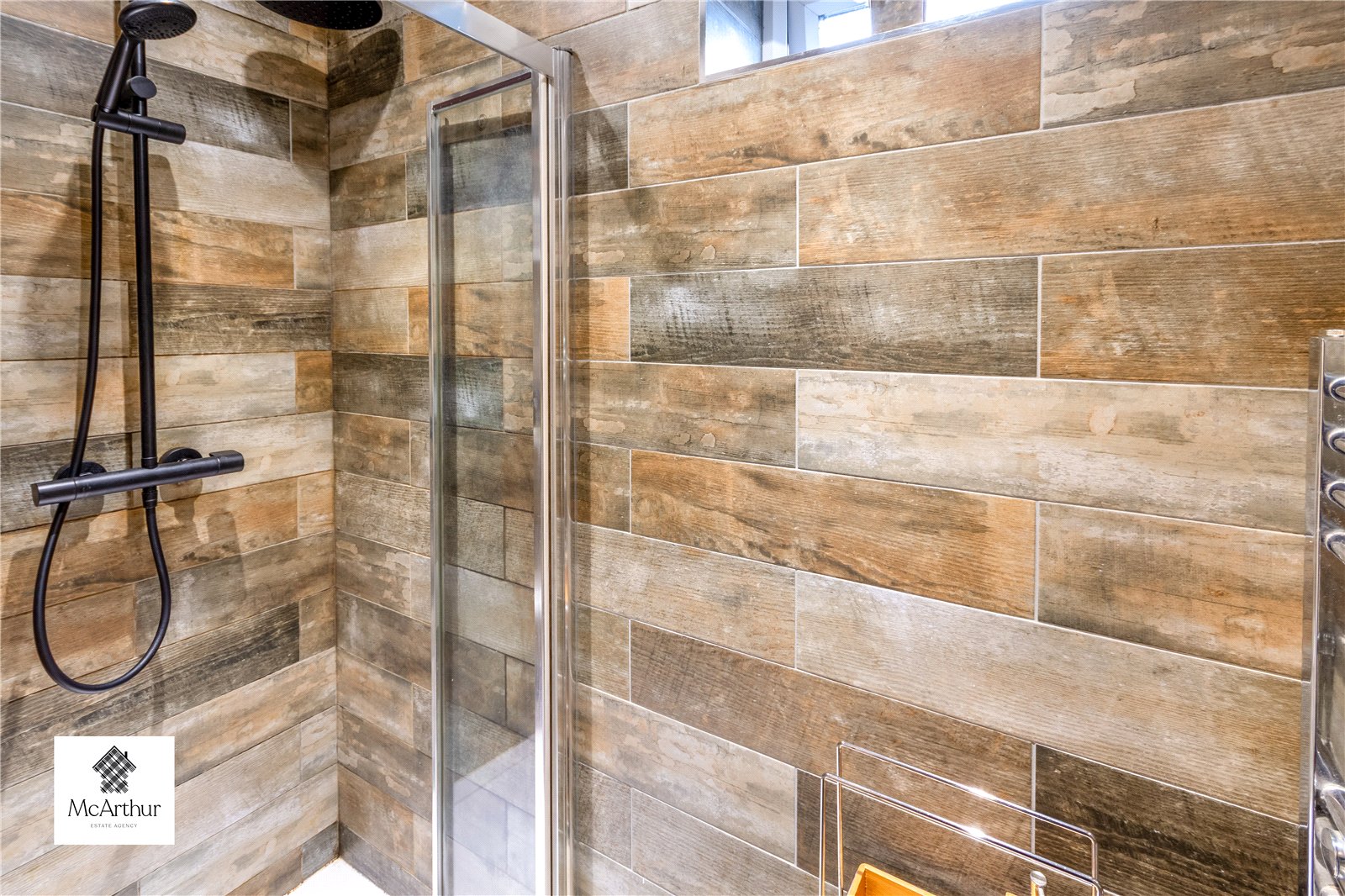 Going up the staircase you are met with three bedrooms. The master and double room have integrated wardrobes with large windows and neutral decoration. There is a further single room that can also be used as an office or storage space. Upstairs has a separate shower room with consists of a modern double shower with a black fixture overhead rain shower and floor to ceiling tiles. The main bathroom has a white bath suite with tiling around half of the room. There is also space for storage under the bath tub.