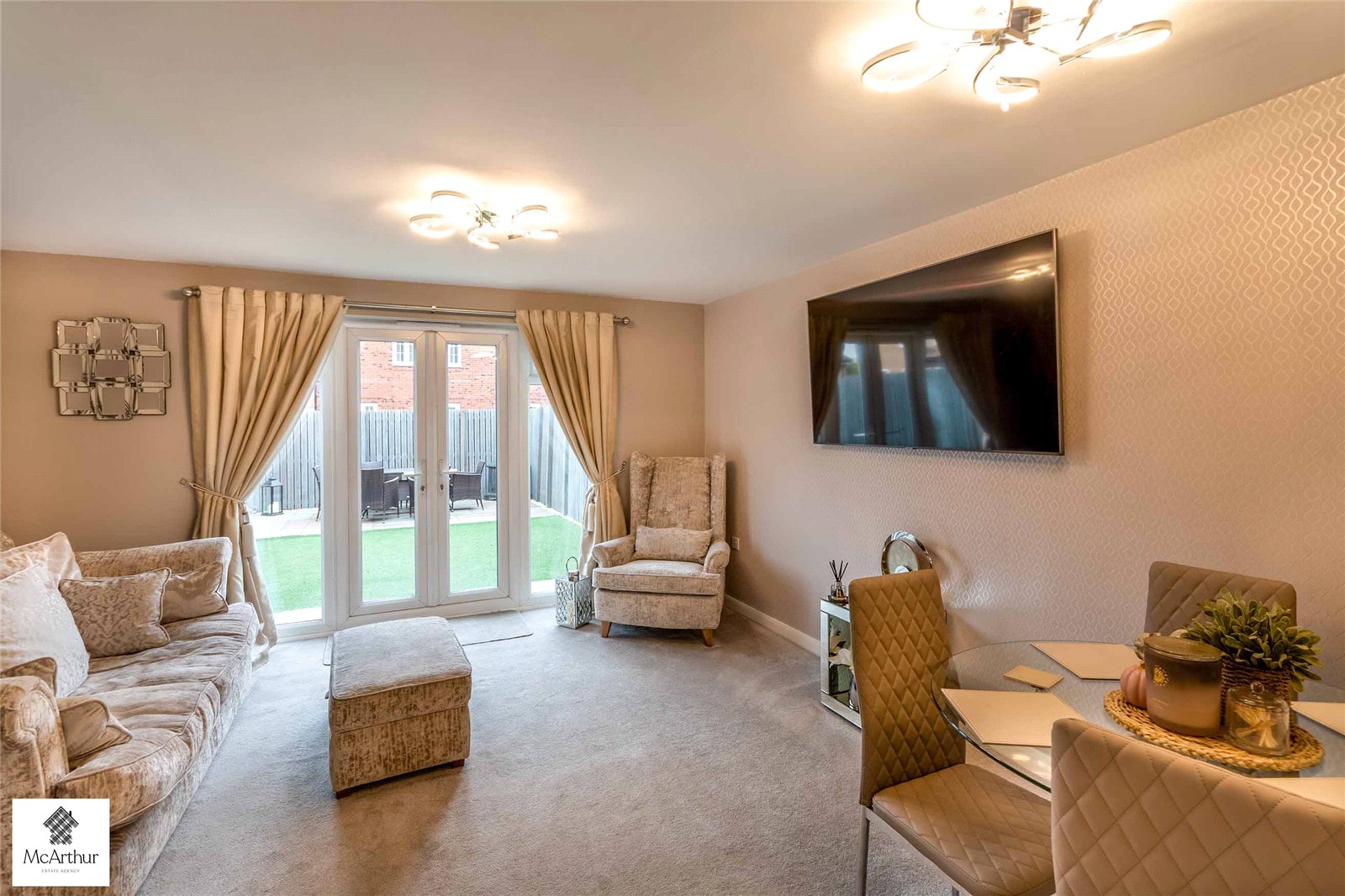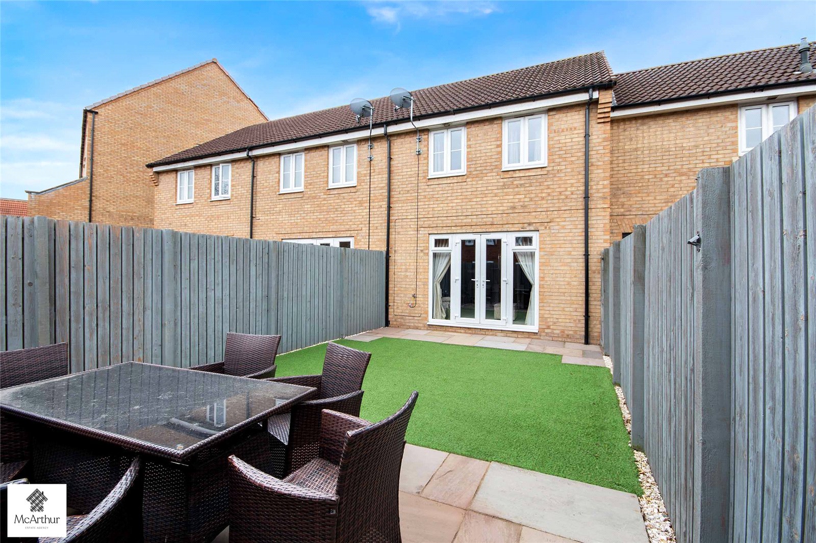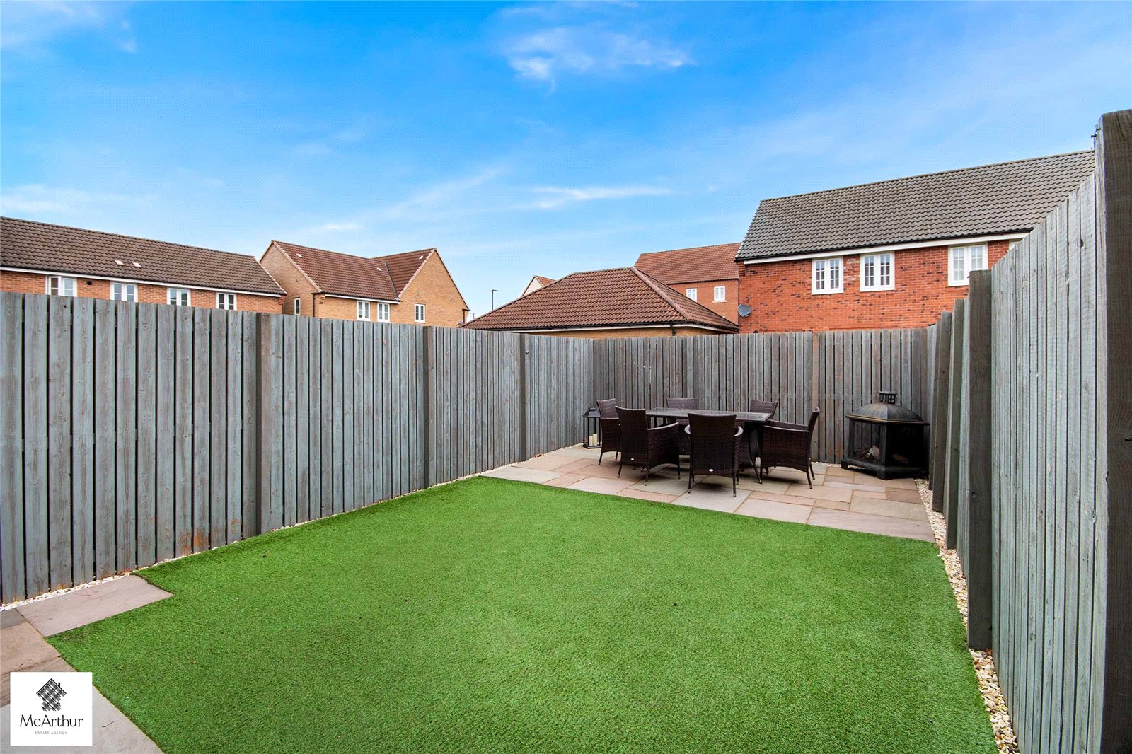 To the front, the property is attractively presented with stone detailing surrounding the pathway leading to the entrance, all enclosed by fencing providing both privacy. The private rear garden is designed for low-maintenance living, featuring a patio seating area ideal for outdoor dining, alongside an astroturf lawn. The space is fully enclosed with fencing, creating a secure and private environment. Further benefits include a garage and allocated off-street parking.