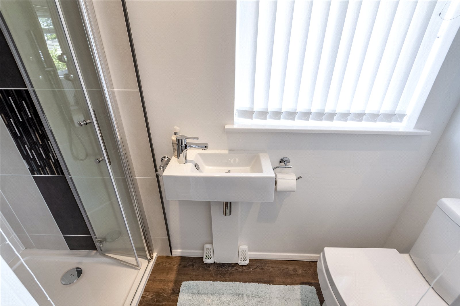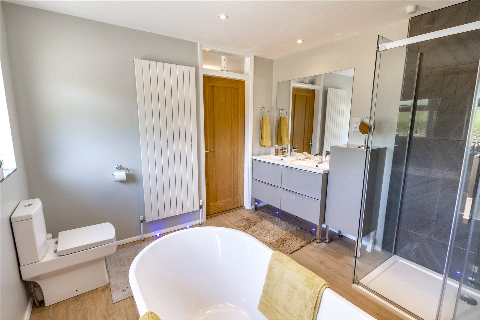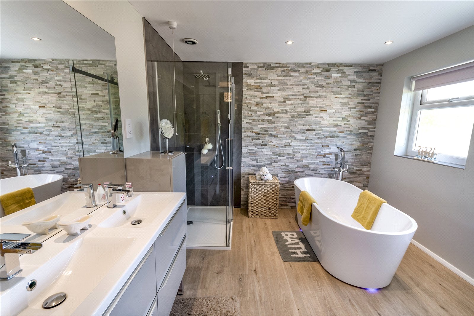 At the front you will also find the fantastic main family bathroom. This is an impressive room featuring a large walk in shower. A large wall attached mirror sits above the twin sinks which also includes plenty of drawer storage. There is also an incredible free standing high specification bath which sits within the room with free standing chrome taps as well a low level lighting. A beautiful feature wall with modern split face mosaic tiling also sets off the bathrooms decor.