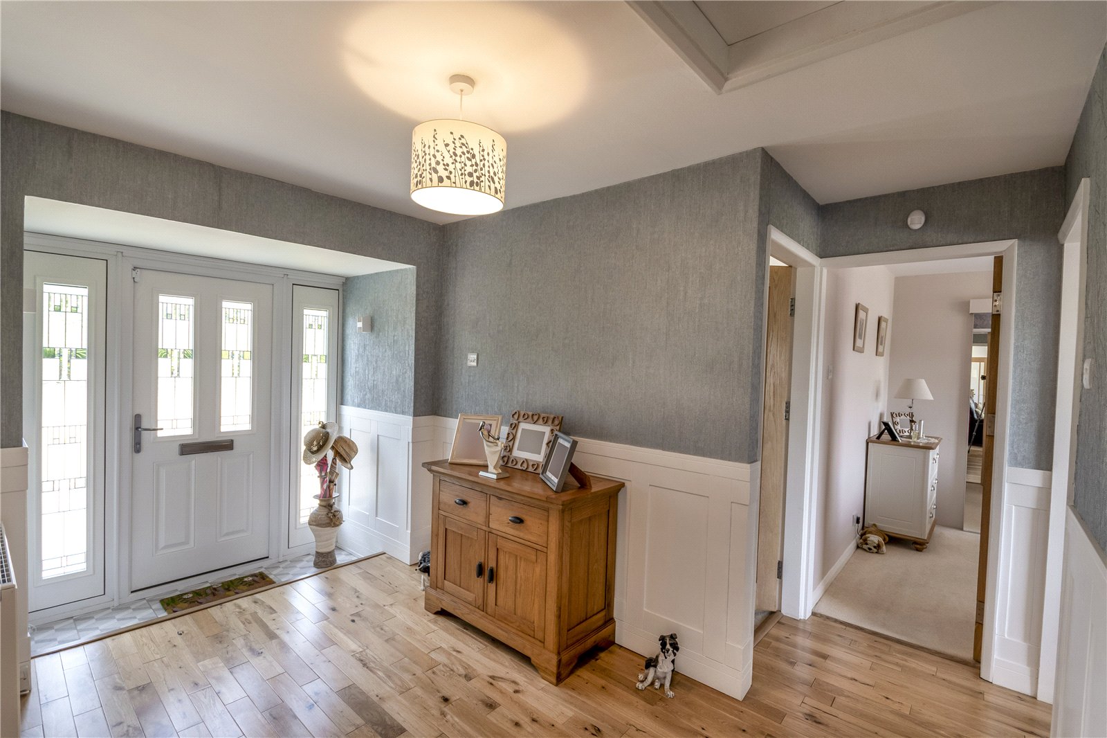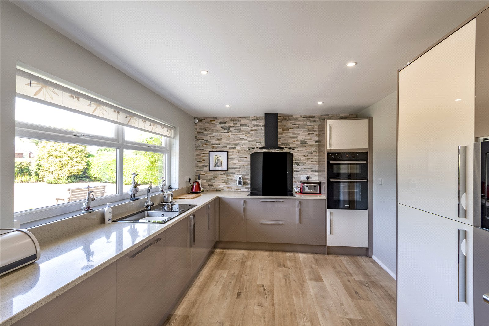 Through the front entrance, you are welcomed into the spacious reception hall. This entrance is well lit through the side panels of the doorway and is presented with excellent decoration with white panelling to the walls. There is also luxurious hardwood flooring which seamlessly flows throughout the home. To the front, you are met with a stunning kitchen with impressive worktop space. The kitchen boasts modern cabinetry and high specification appliances and decoration including split face mosaic tiling and spotlights to the ceiling.
