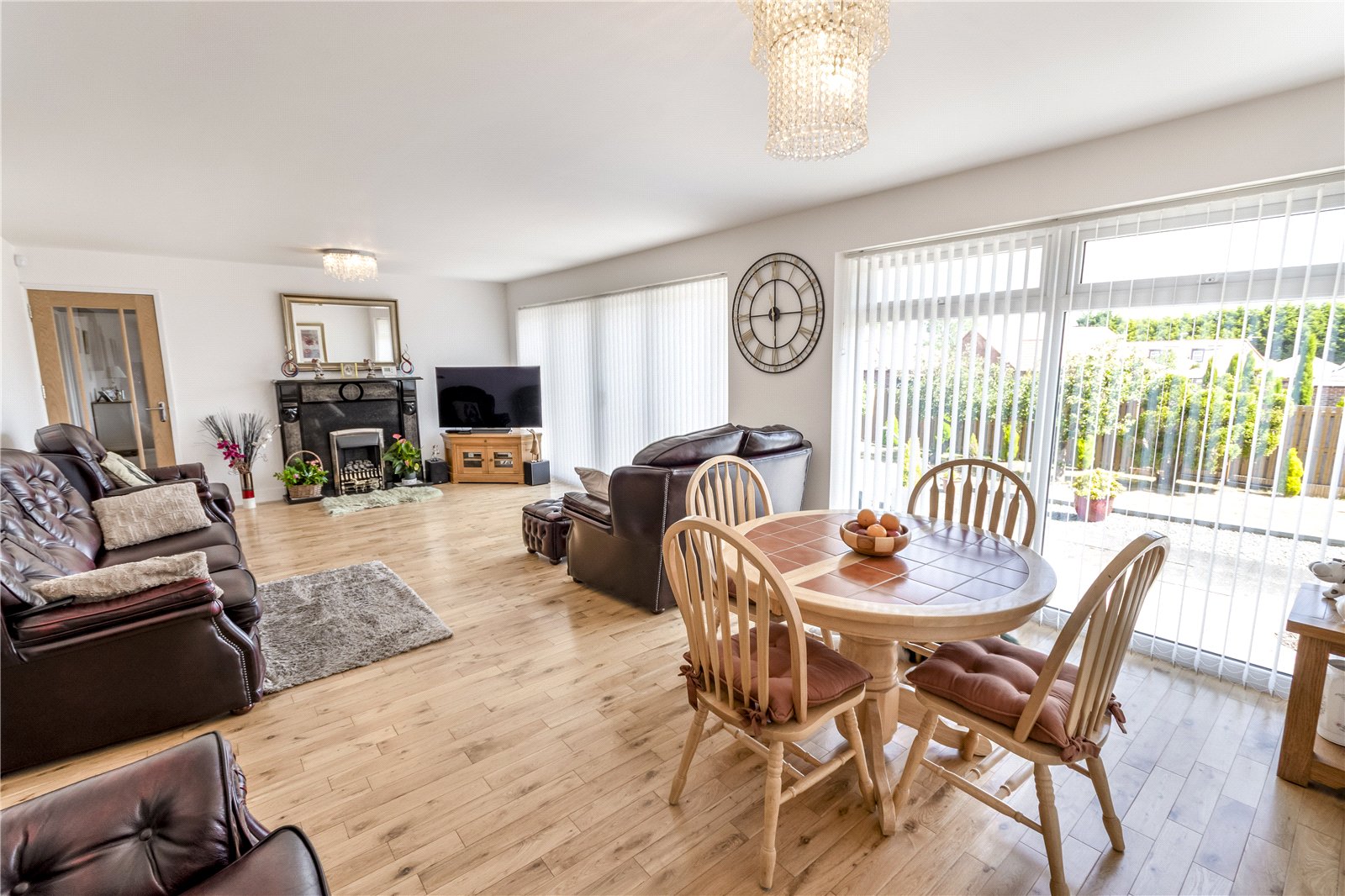 Through the kitchen, sits the spacious lounge/diner including a feature fireplace, and a large windows and doors drawing in lots of natural lighting and provides direct access into the rear garden.