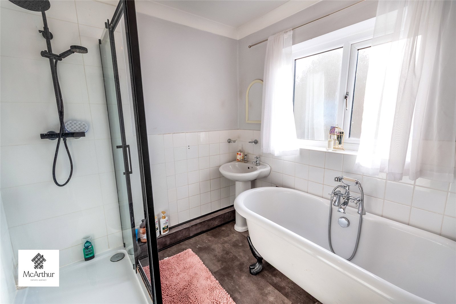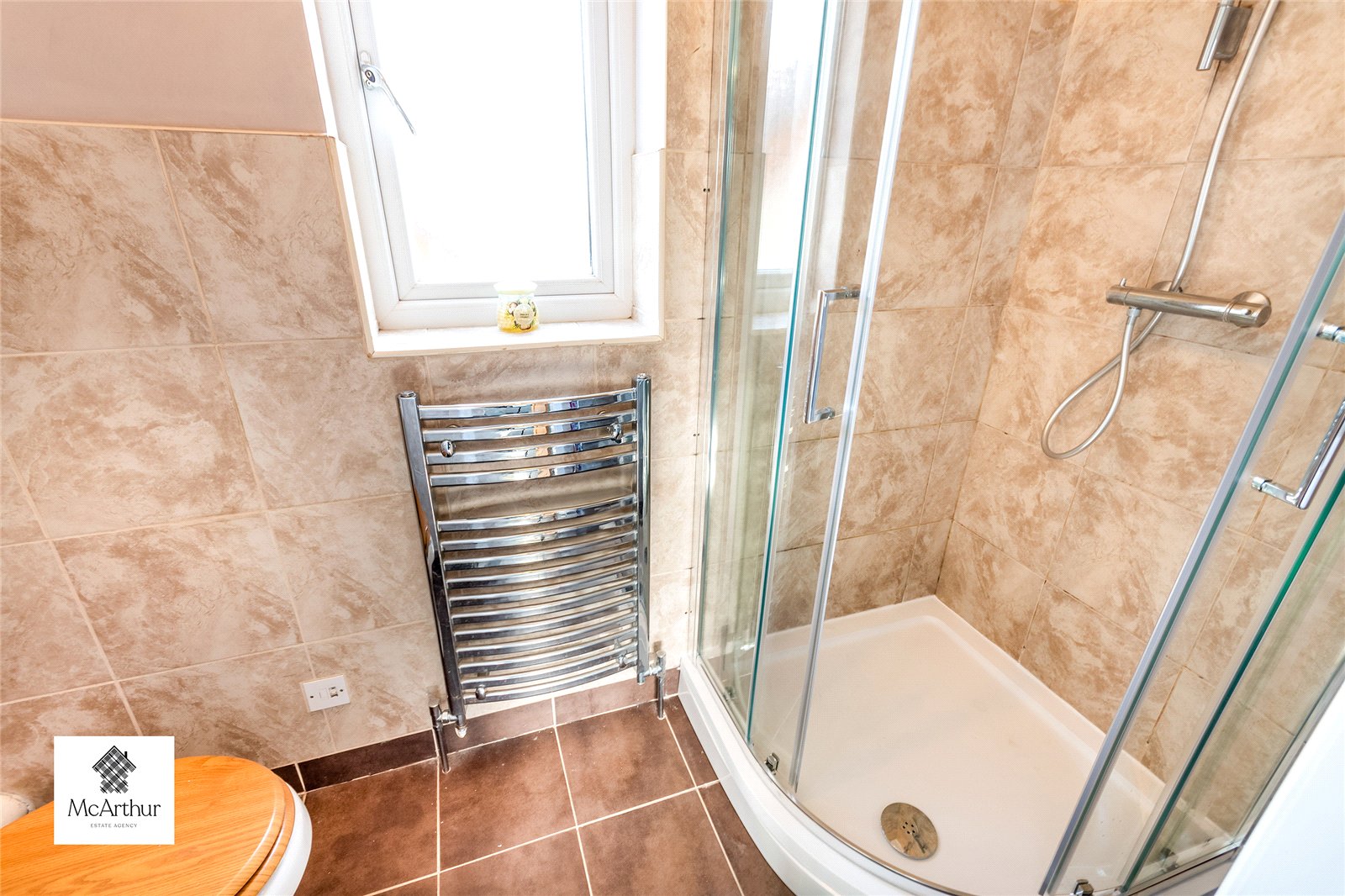 Leading up the stairs to your left is the master bedroom with an ensuite. This bedroom is neutrally decorated with lots of windows to allow as much light in as possible. The en-suite is furnished with shower cubicle. Following the master bedroom there is another double and single room. The main bathroom has a bath tub and a separate double shower.