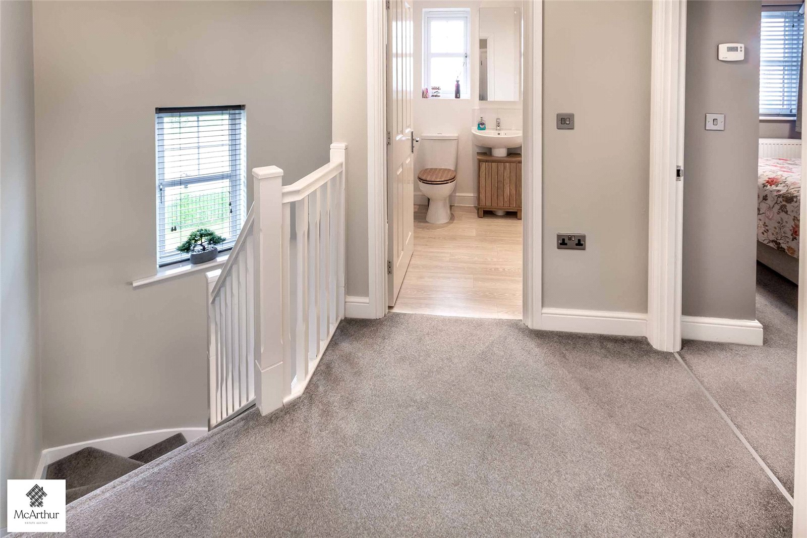 Arriving onto the first floor this home continues to impress with a spacious and well-laid-out landing, providing access to all rooms and benefiting from a useful integrated storage cupboard. Going into the master bedroom is a generously proportioned and well-presented space, complete with built-in cupboards and the added benefit of a private en-suite shower room, offering both comfort and convenience. There are two further well-sized double bedrooms, making the property ideal for families, guests, or home working. The family bathroom is finished to a high standard, featuring floor-to-ceiling tiling and a contemporary suite, including a bath with overhead shower, creating a stylish and practical space. The bedrooms benefit from the ducted air conditioning/heating system, ideal for any season.