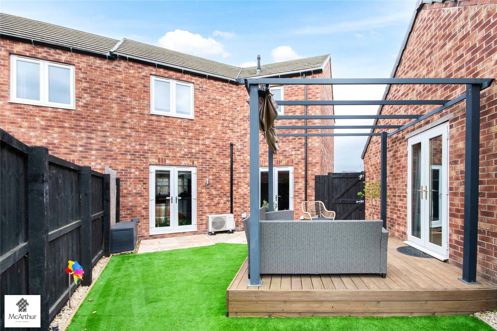 To the front of the home you are presented with a well-kept lawn hosting shrubbery, and a path cutting through to the front door. Alongside the front garden sits a large driveway presenting space for at least three vehicles. To the top of the driveway you are presented with the spacious detached garage. This space is currently set up as a cinema room also including a ducted air conditioning system both cooling and heating the space, controlled by a wall mounted thermostat. A well maintained rear garden wraps around the garage, including a decking/seating area with a retractable rain or sun canopy. Moreover, the rear garden presents a second raised lawn, sitting alongside an additional patio/seating area, and flower beds.
