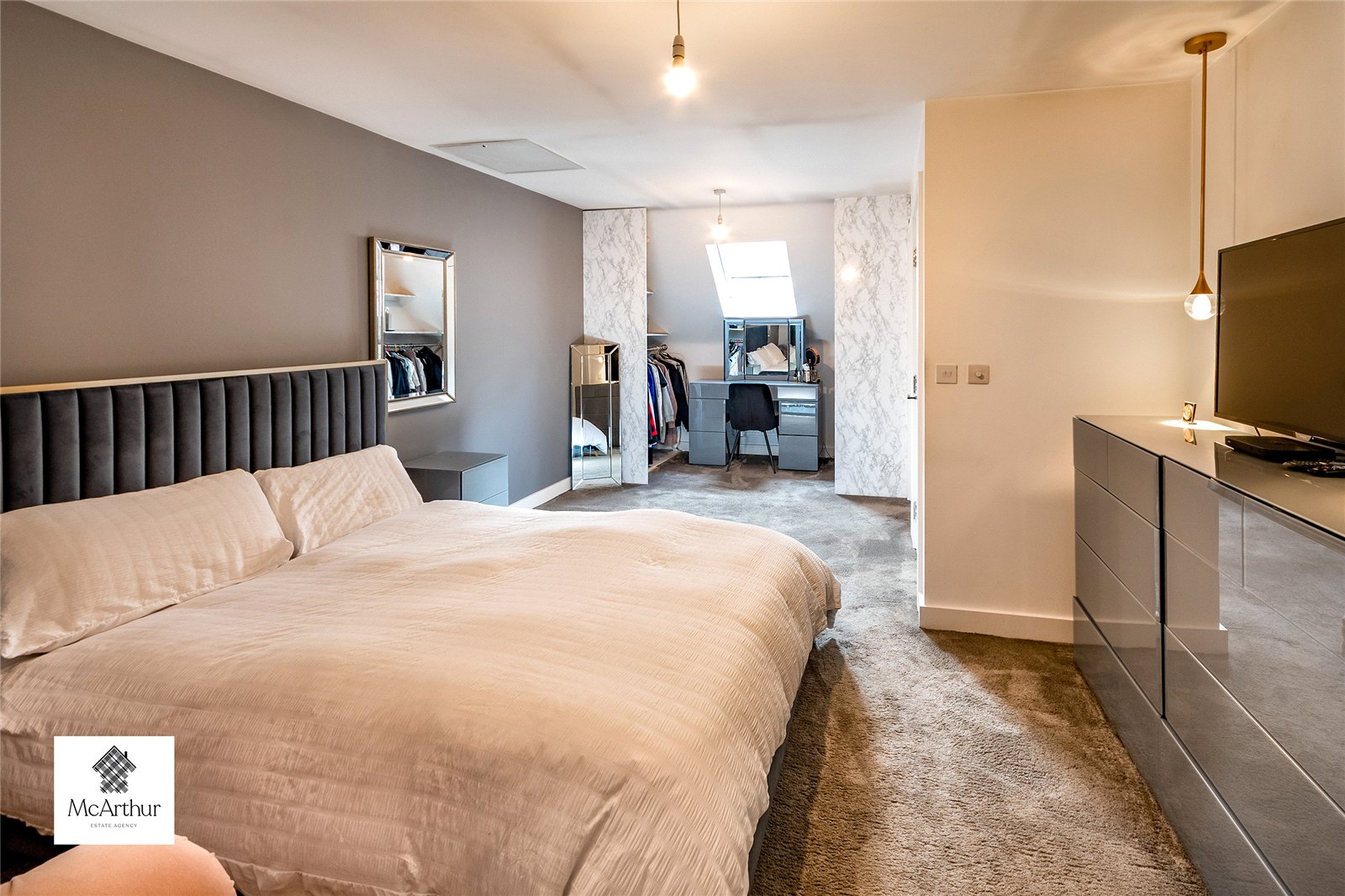 The master bedroom is on the second floor with a dressing room and an ensuite. This is a large open space with great lighting and storage space. The ensuite has a double shower with grey flooring and tiles. Going into the dressing room there is a skylight flowing additional natural light down. There are gold fixture lights that hang all around the room giving the room a pop of colour.