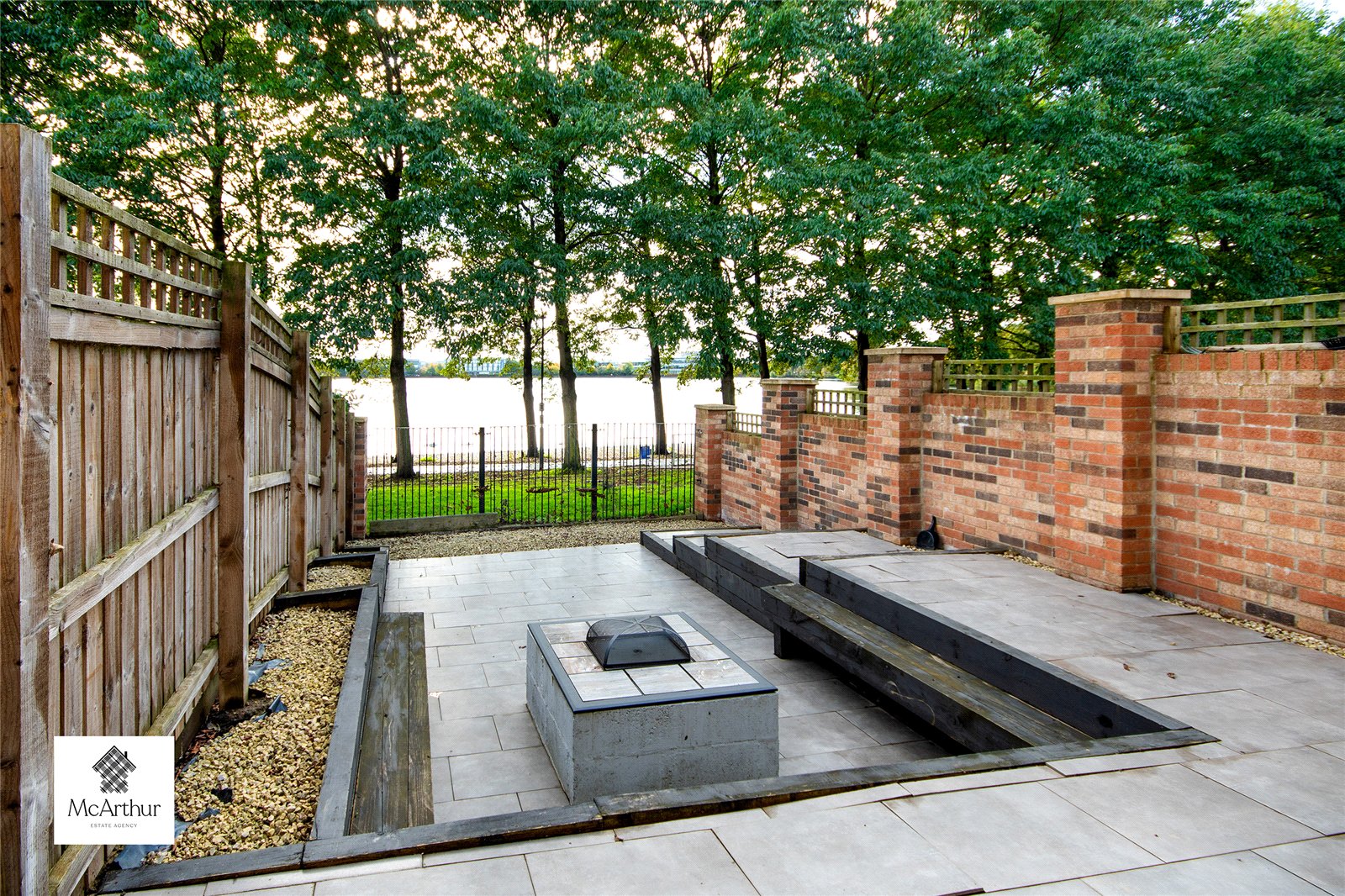 To the front of the home, you are met with a large driveway, providing ample space for multiple vehicles. Wandering down the side of the home, you are invited onto the private rear garden, hosting a seating area, a firepit, and views across the lake.