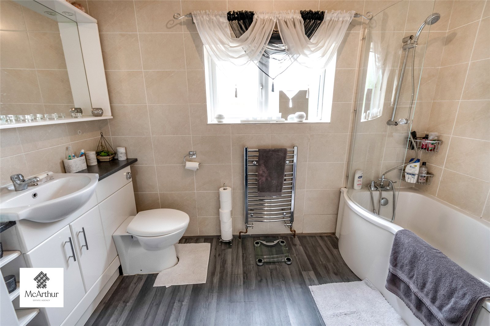 In the main bathroom you find a white bathroom suite with bath and overhead shower. There is also a separate W/C and integrated sink with storage vanity all with chrome fixtures.