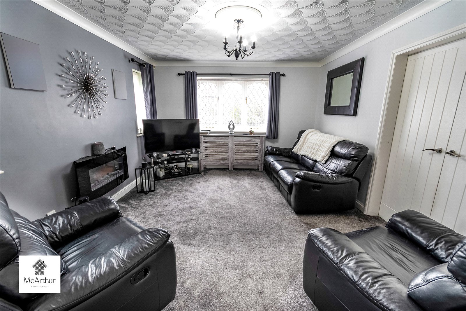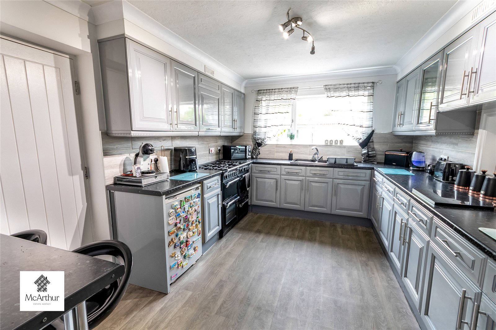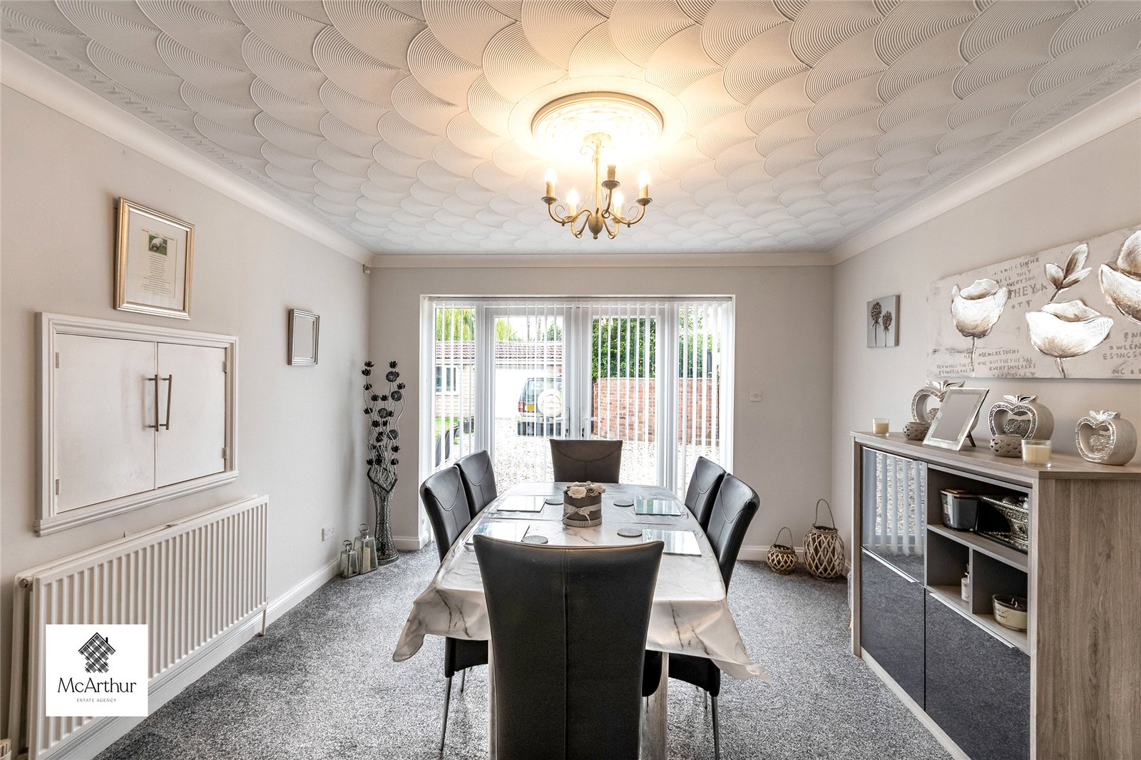 Through the inviting front porch you enter a spacious hallway. Double doors to the right then lead into a large lounge with modern grey decoration and electric fireplace. Through the lounge you have direct access into a separate dining room with ample storage space for hosting. The kitchen offers excellent storage and worktop space with grey cabinetry and also has an additional breakfast seating area.