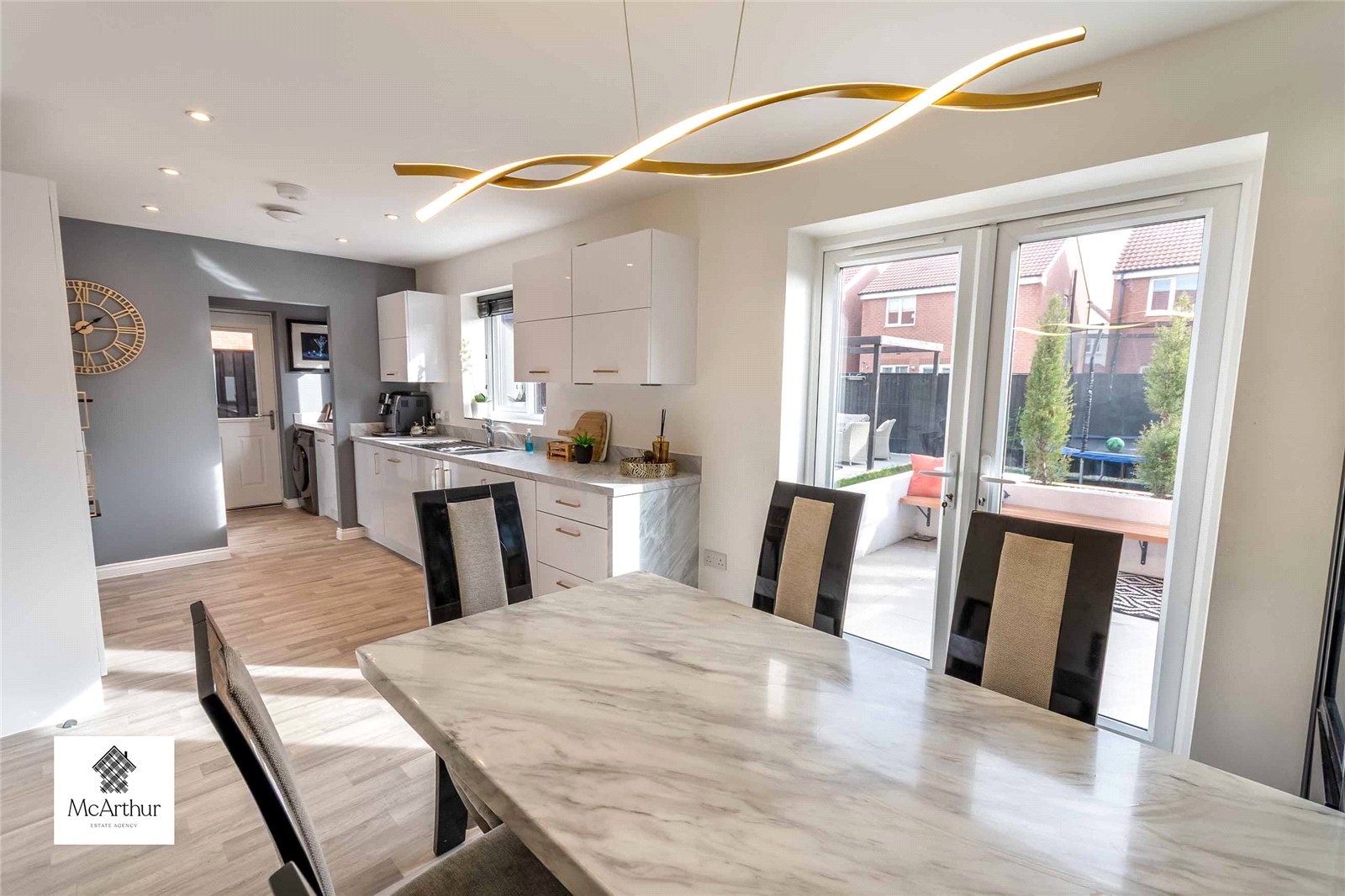 When you walk into this home you are welcomed into the entrance hall with the lounge to the right. The lounge is a welcoming space decorated to a high standard with a media wall featuring integrated television and spotlights in each of the setback areas. At the end of entrance hall there is the kitchen/dining room with lots of worktop space, modern cabinetry and integrated oven. The kitchen provides access to the utility room with a W/C, and access out to the side of the home. In the dining quarter there are double patio doors leading to the private rear garden.